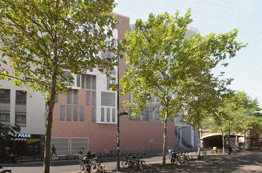 Diese Übung ist ein Mischprojekt von Büros und Sozialwohnungen an der Kreuzung der Straßen Tolbiac und Chevaleret im 13. Bezirk von Paris.